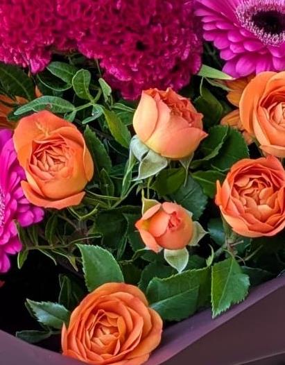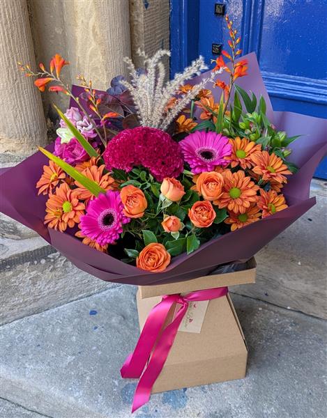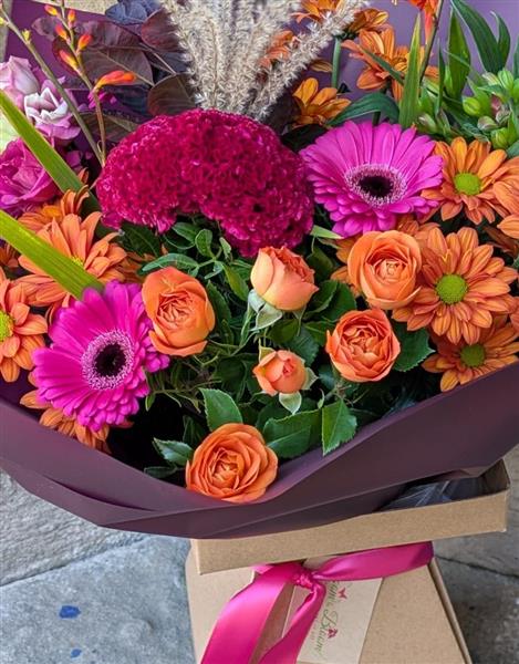 This vibrant creation features bold magenta Gemini and velvety Celosia, nestled against a warm backdrop of rusty orange Chrysanthemums and delicate spray Roses. Architectural Crocosmia and soft, feathery grasses add beautiful texture and height, making this bouquet a truly unforgettable, modern take on the season.