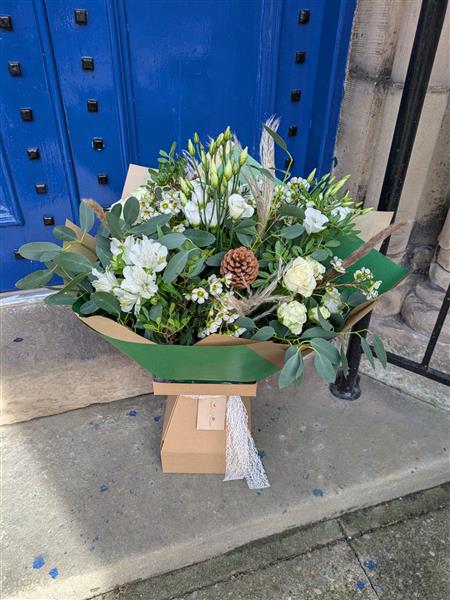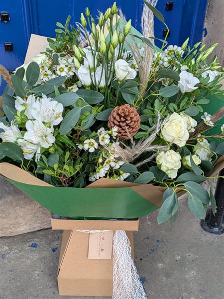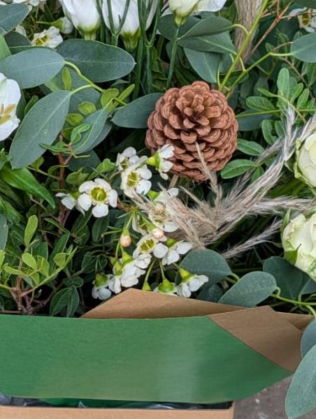 This arrangement is like a walk through the crisp countryside. It’s a beautiful, wild gathering of creamy whites and fragrant Eucalyptus, with rustic touches of pinecones and the softest bunny tail grasses. It’s natural, elegant, and perfectly captures the untamed beauty of autumn.