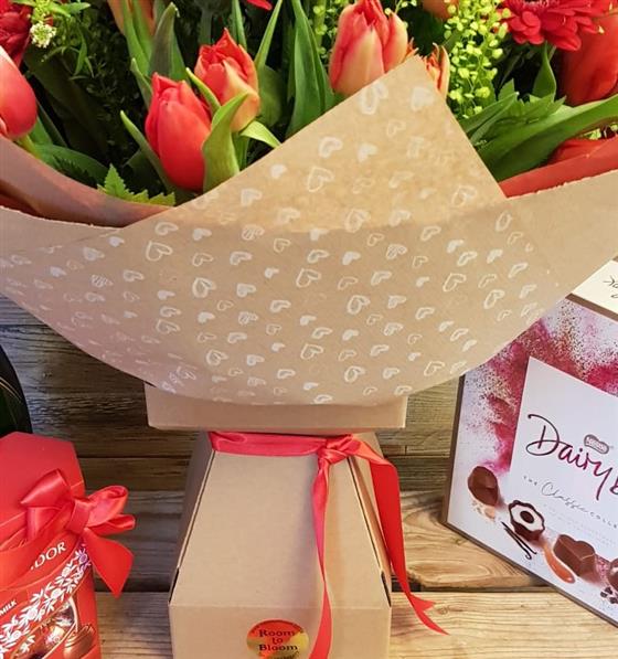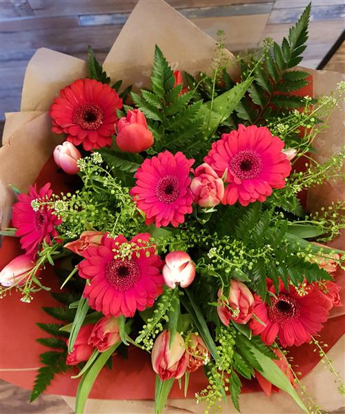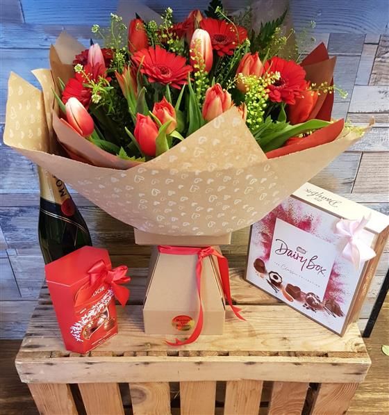 Surprise that special person with our Be my Valentine! A stunning combination of assorted red Tulips, red Germini surrounded with seasonal foliage!