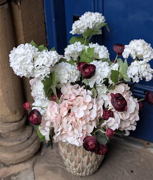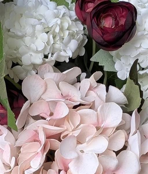 The Blushing Belle perfectly balances soft, elegant pinks and creams with the dramatic depth of rich burgundy blooms, creating a timeless look that brings opulence to any space.