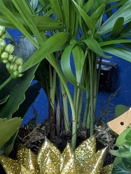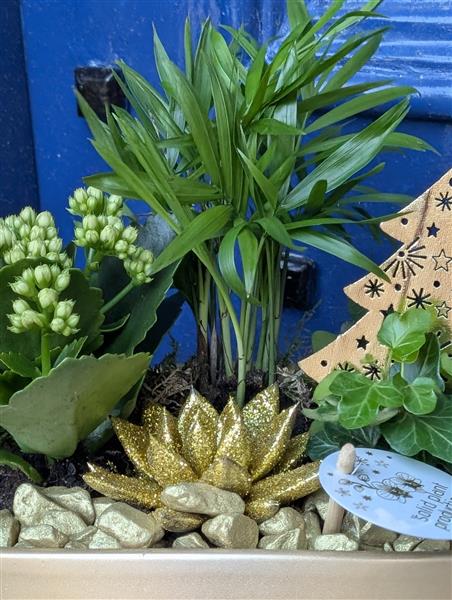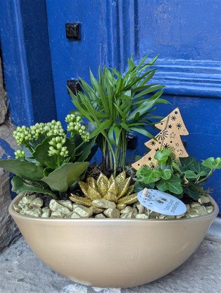 Presenting a charming and vibrant Christmas planter, perfect for adding a touch of festive cheer to any home or office. This arrangement is set in a stylish, contemporary golden bowl, creating an immediate sense of warmth and luxury.