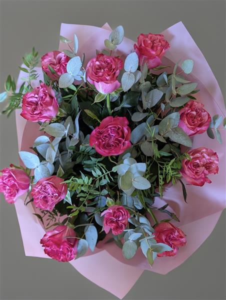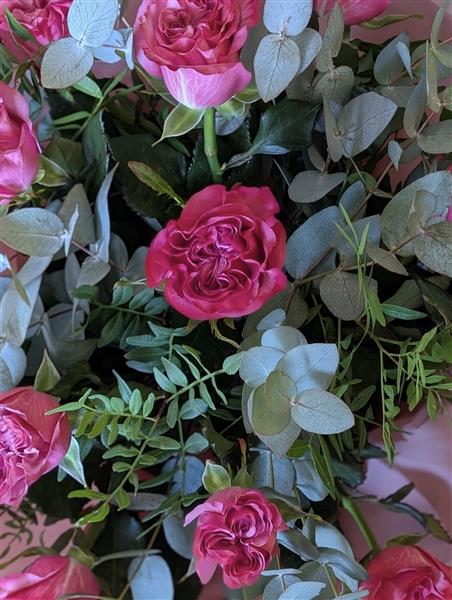 A beautiful bouquet of 12 pink roses, symbolising admiration, happiness and love, surrounded by lush Foliage 💕