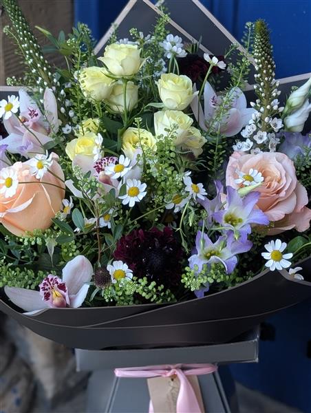 Designed to mimic the effortless beauty of a secret garden at twilight, this arrangement balances the sophisticated luxury of Cymbidium orchids and spray Roses with the playful, rustic charm of Tanacetum