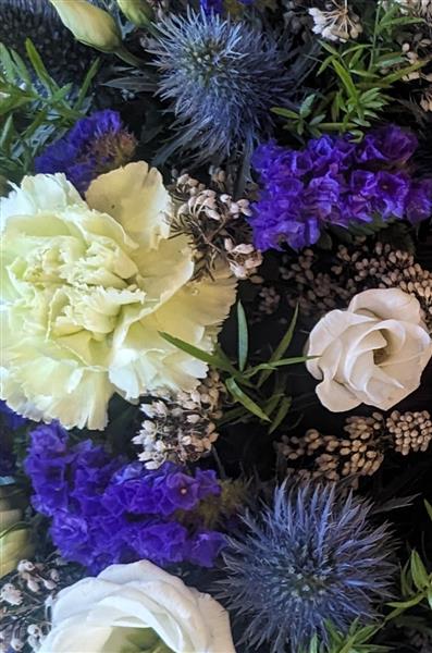 A compact cemetery posy arrangement in an Oasis dish. Choose from male, female colour options or a mix of both or contact us to discuss your requirements.