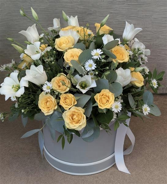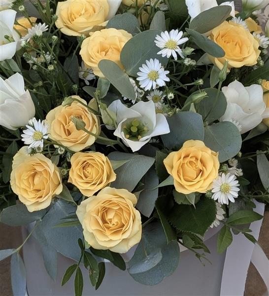 Florist Choice Floral Arrangement in a Chic Hatbox finished off with contrasting ribbon.