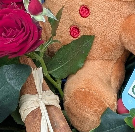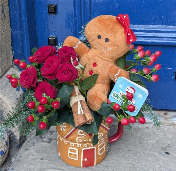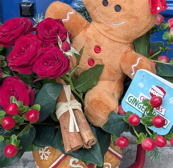 Get ready to spread some festive cheer! Our 'Gingerbread Kisses' arrangement is the perfect blend of warmth and whimsy, featuring delightful spray Roses, festive Berries, and an adorable gingerbread friend, all nestled in a charming gingerbread house mug.