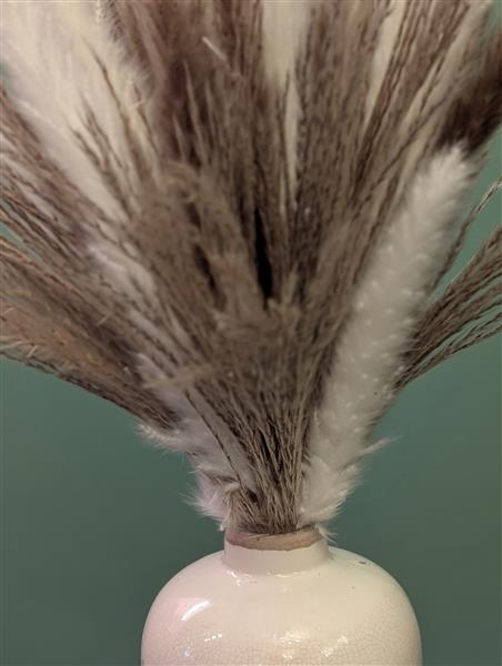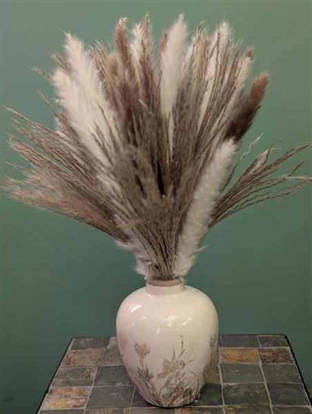 This curated look brings together the wild, airy texture of premium Pampas Grass and the exquisite craftsmanship of a Loxley and Spey Interiors crackle-glaze vase. We love how the delicate floral illustrations on the ceramic mirror the soft plumes of the grass, creating a seamless bridge between the outdoors and your home.