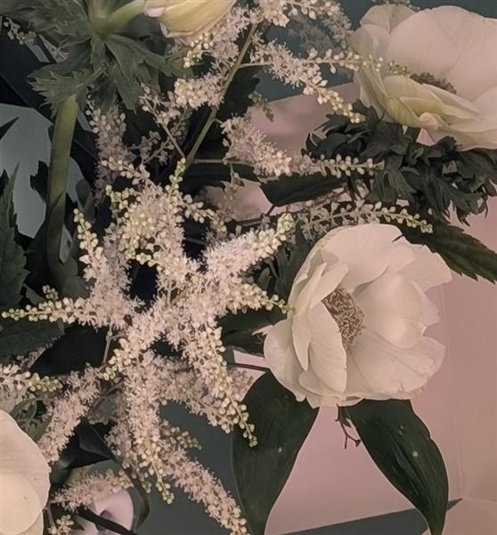 The Loxley Linen: A stunning "wild-meadow" arrangement of architectural Anemones and feathery Astilbe, housed in a keepsake chalk-white ceramic pitcher.