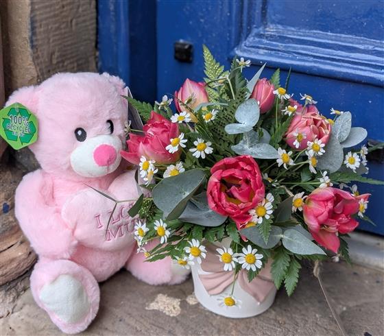 We’ve taken our newly revamped Mrs. Bloom—featuring those gorgeous pink double Tulips and dainty Tanacetum in our pink bow ceramic pot—and paired her with the ultimate companion.