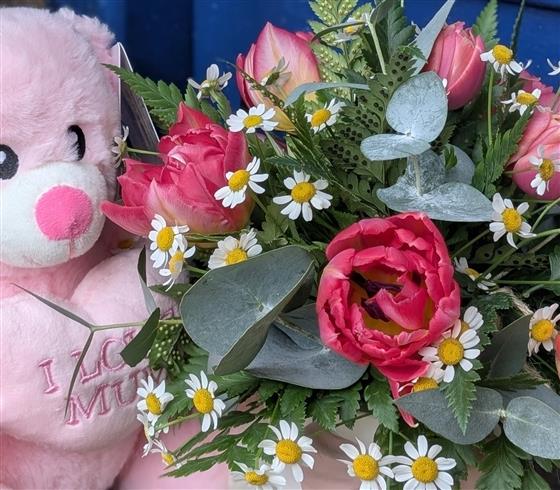 Say hello to her Bestie: a super soft, cuddly pink bear holding a heart that says it all: "I Love Mum".