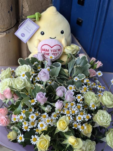 ​It Features an adorable 18cm "Mum, You're the Zest" plush lemon nestled right in the blooms.