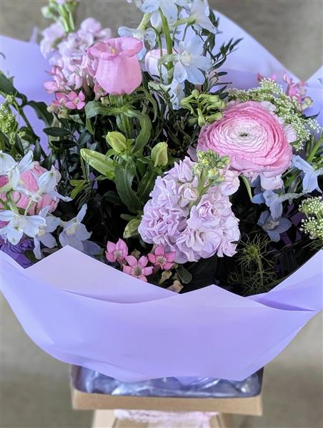 A luxury Handtied aqua bouquet hand crafted from seasonal blooms delivered to you or a loved one.