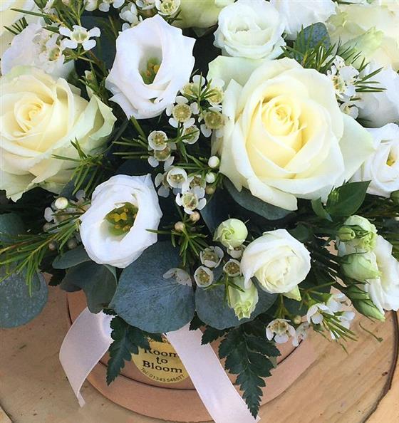 Our Pure Elegance is suitable for all occasions, a keepsake Hatbox filled with white Roses, Lisianthus, seasonal filler & lush Foliage 🤍🌿🤍