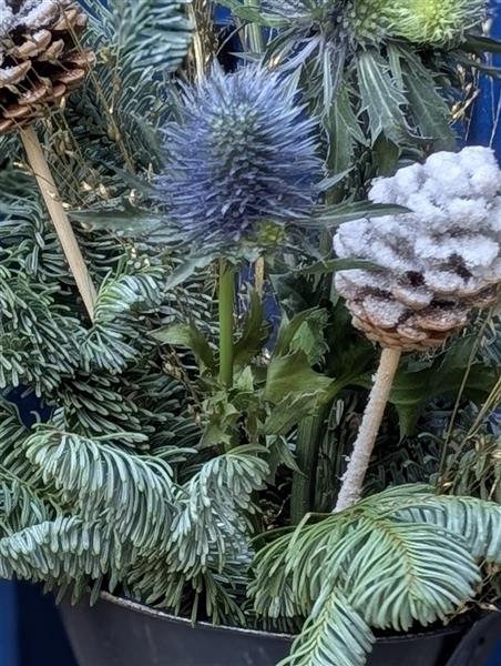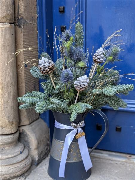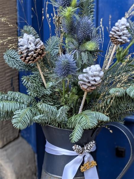 Say hello to our Scottish Christmas Thistle arrangement. This unique piece perfectly blends the iconic national flower of Scotland—the beautiful, steely-blue thistle—with classic winter greens and frosted pinecones.