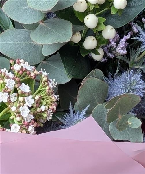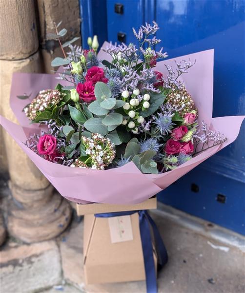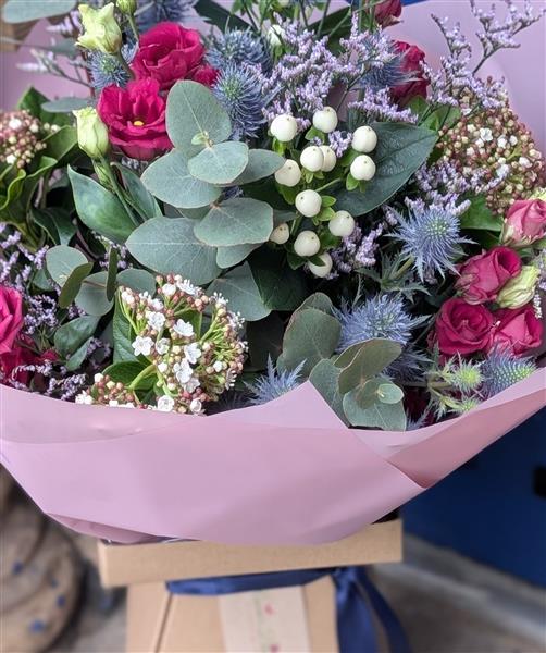 Inspired by the wild beauty of the Scottish landscape, this bouquet balances deep, dramatic tones. it features rich magenta blooms nestled among iconic blue Eryngium (Thistles), delicate white berries, and fragrant, silvery Eucalyptus foliage. The result is a sophisticated bouquet that captures the crisp air and magical light of a winter’s day in Scotland.