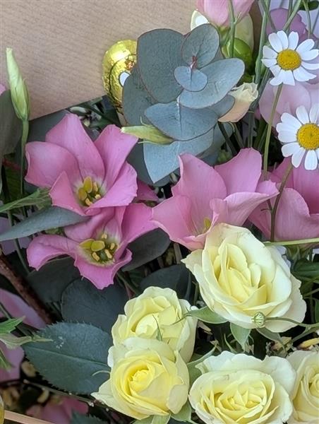 Nestled among a whimsical mix of seasonal pastels your recipient will discover a hidden stash of chocolate eggs.
