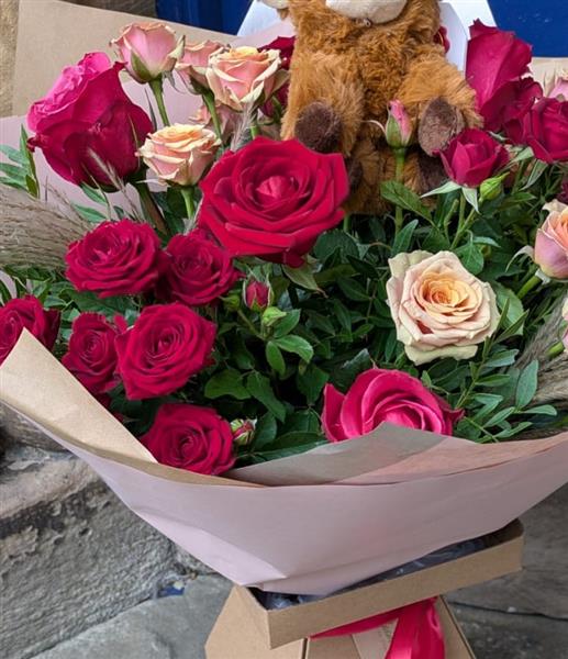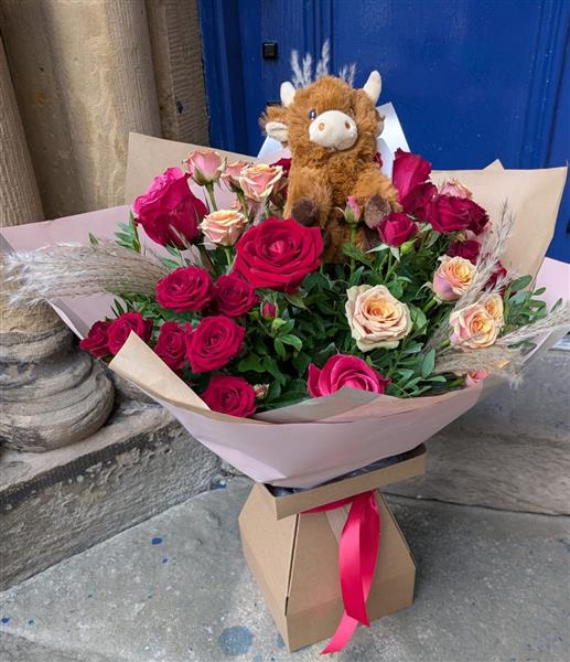 We paired a gorgeous Roses with the cutest coo in town to create the ultimate gift. It's flowers and a cuddle, all in one! Angus the Highland Cow is ready to be your wingman.