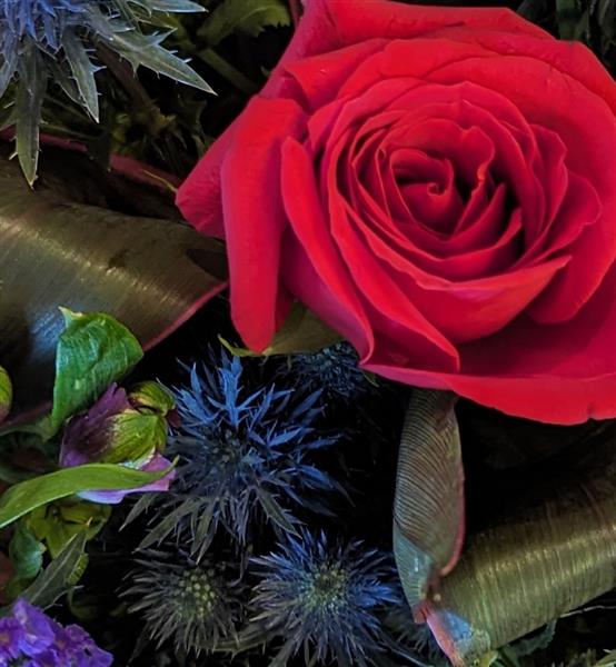 Arranged and delivered in water, this arrangement includes a Red Rose at the centre of the bouquet.