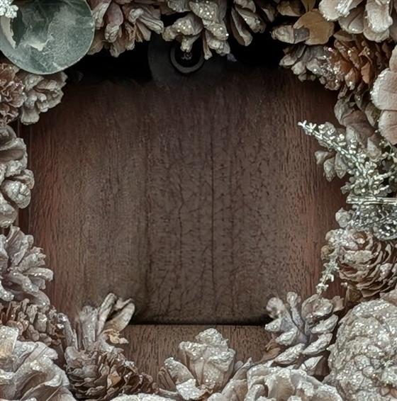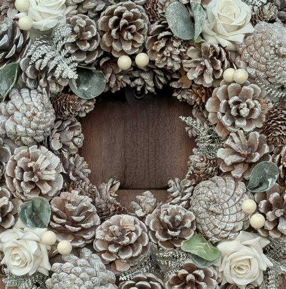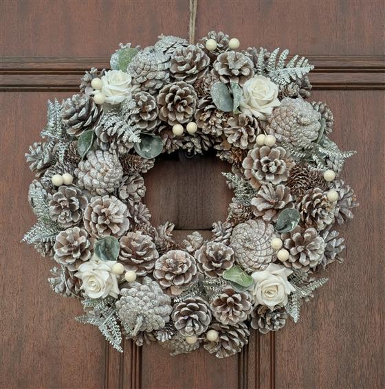 This frosted pinecone and rose wreath embodies the serene elegance of the season. Perfect for welcoming guests with a touch of winter charm.