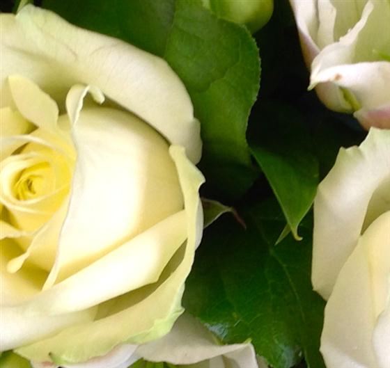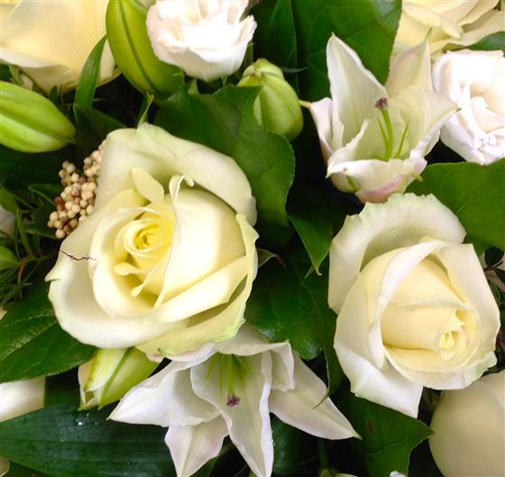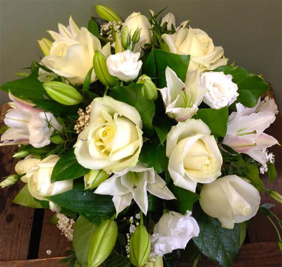 A classic bouquet of white oriental lilies, white roses and white lisianthus with contrasting dark green foliage.